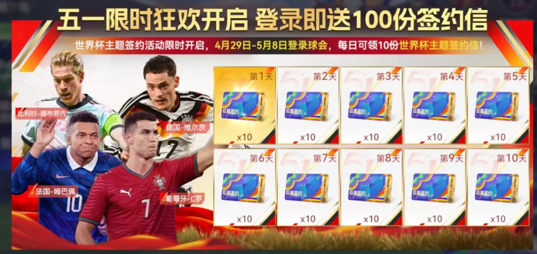 世界杯主题签约活动限时开启,4月29日-5月8日登录球会,每日可领10份世界杯主题签约信!五一节最硬核的福利来袭——无论是补强阵容还是收集心仪球星,百抽好礼让你想抽就抽!签到不缺席,巨星等着你!