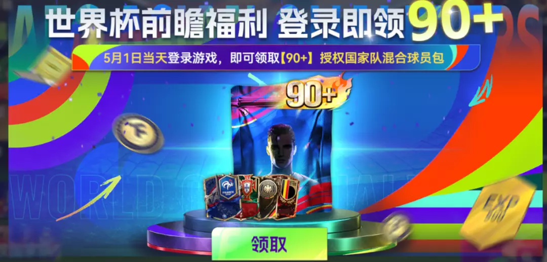 5月1日当天登录游戏,即可领取【90+】授权国家队混合球员包。假期第一份大礼,已经为你备好!五一节当天,重磅福利【90+】球员包直接相送!提前拥有,提前享受,让你的阵容与世界杯同频共振!