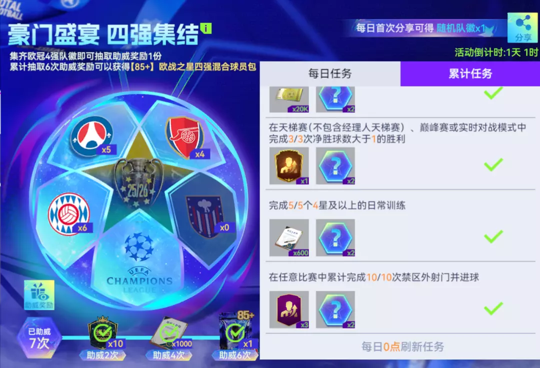 集齐欧冠4强队徽即可抽取助威奖励1份,累计抽取6次助威奖励可以获得【85+】欧战之星四强混合球员包。火星撞地球的欧冠半决赛即将上演,四支豪门向决赛门票发起冲击!集齐队徽为四强球队助威,就有机会把欧战球员带回你的阵中!