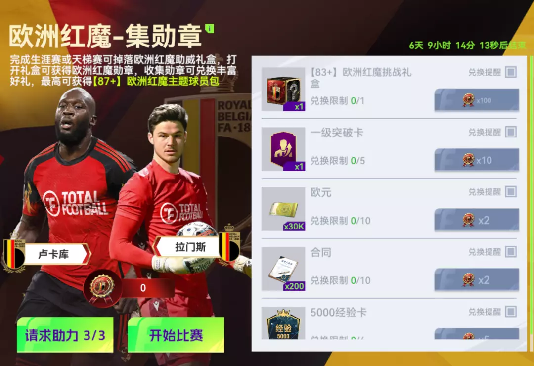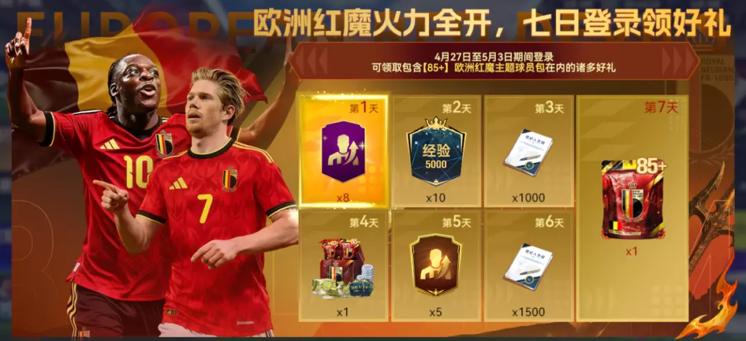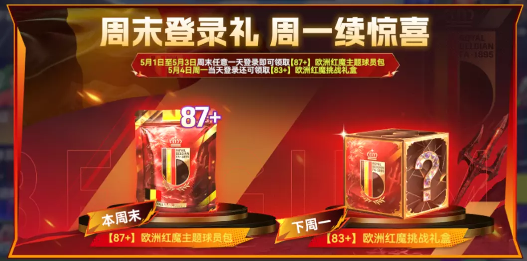 5月1日至5月3日周末任意一天登录即可领取【87+】欧洲红魔主题球员包,5月4日周一当天登录还可领取【83+】欧洲红魔挑战礼盒。当五一假期和周末惊喜完美重叠!只要登录上线,比利时当家球星直接空降你的阵中!周一记得打卡,还能再薅一份挑战礼盒!