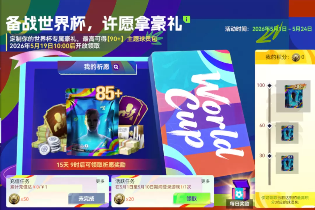 定制你的世界杯专属豪礼,最高可得【90+】主题球员包。许愿进度推进,奖励层层解锁,最终有机会赢得【90+】重磅豪礼!让梦想照进现实,为各位主帅的美加墨之旅储备最强战力!