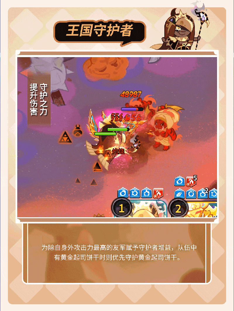 释放独特烟雾,魅惑敌人并提升伤害,对烟雾内敌人造成多次伤害,最后产生爆炸伤害。释放技能时,为除自身外攻击力最高的友军赋予守护者增益,队伍中有黄金起司饼干则优先赋予。与黄金起司饼干同队时,触发黄金城市守护者增益。