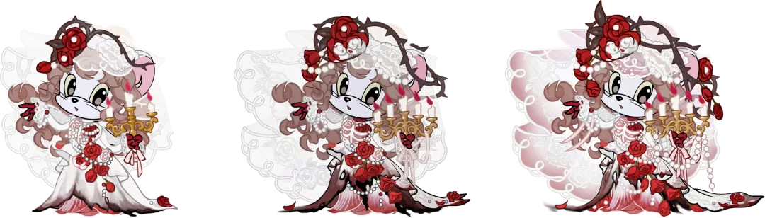 在3S级状态时,米雪儿将会拥有走、跑、跳等全套的玫瑰花瓣与珍珠头纱特效,在使用护盾饮料后,米雪儿身上还会出现珍珠头纱上荆棘环绕的护盾哦!