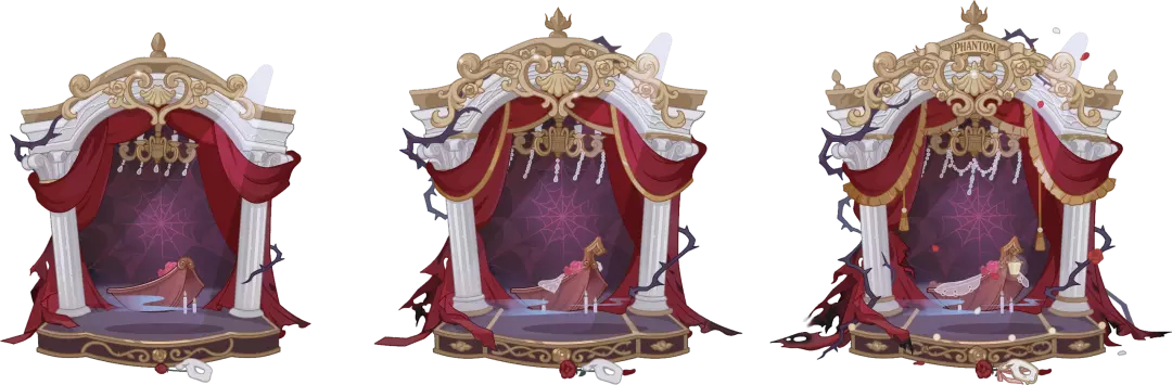 皮肤灵感源于著名歌剧篇章与其被延伸创作的各类作品,服装以繁复奢华的白色婚纱戏服与珍珠头纱为主体,以高饱和的红玫瑰增添一抹亮色,裙摆介于婚纱与戏服间的繁复设计,更凸显歌剧表演者的身份。