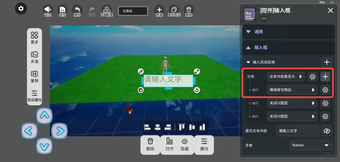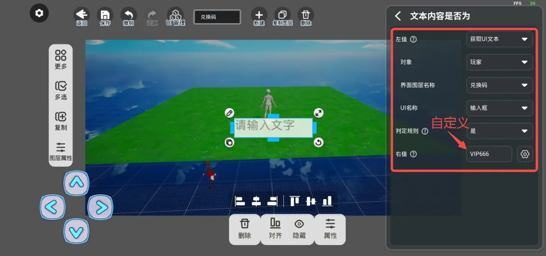 在【编辑界面】的【文字】中选择【输入框】,然后在“输入完成回调”中进行上图的设置,关闭UI图层可根据自身需求进行设置,核心为红框内的内容。点击“输入完成回调”右侧“+”,选择“文本内容是否为”的指令,然后参考下图进行相关内容的设置,右值可设置自己喜欢的内容。
