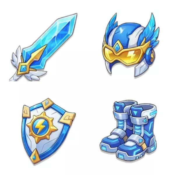 武器-霹雳电刃,头部-霹雳电镜,防具-霹雳电盾,鞋子-霹雳电靴