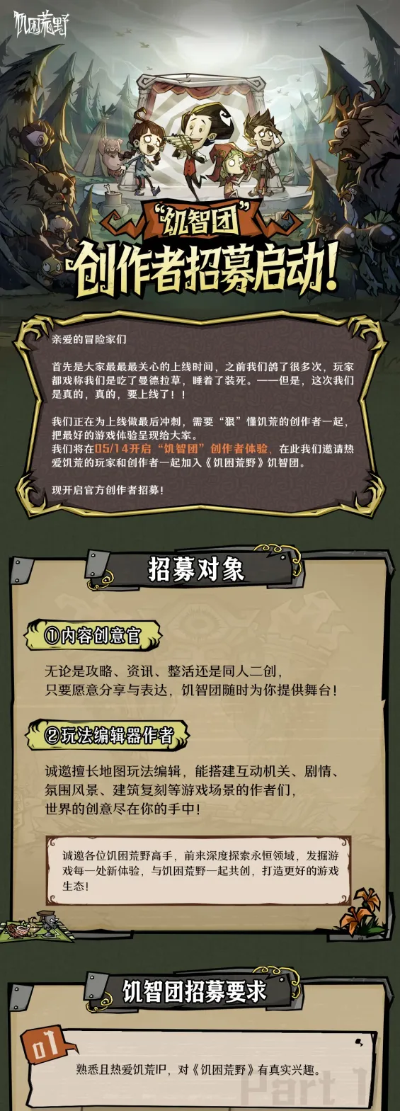 我们将在5月14日,开启“饥智团”创作者体验,欢迎热爱饥荒的你们与我们共同打造更好的游戏!
