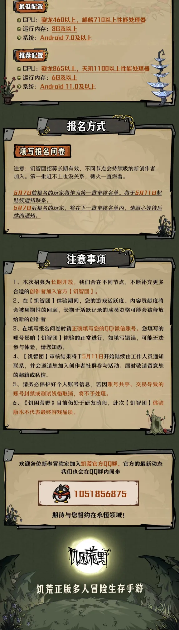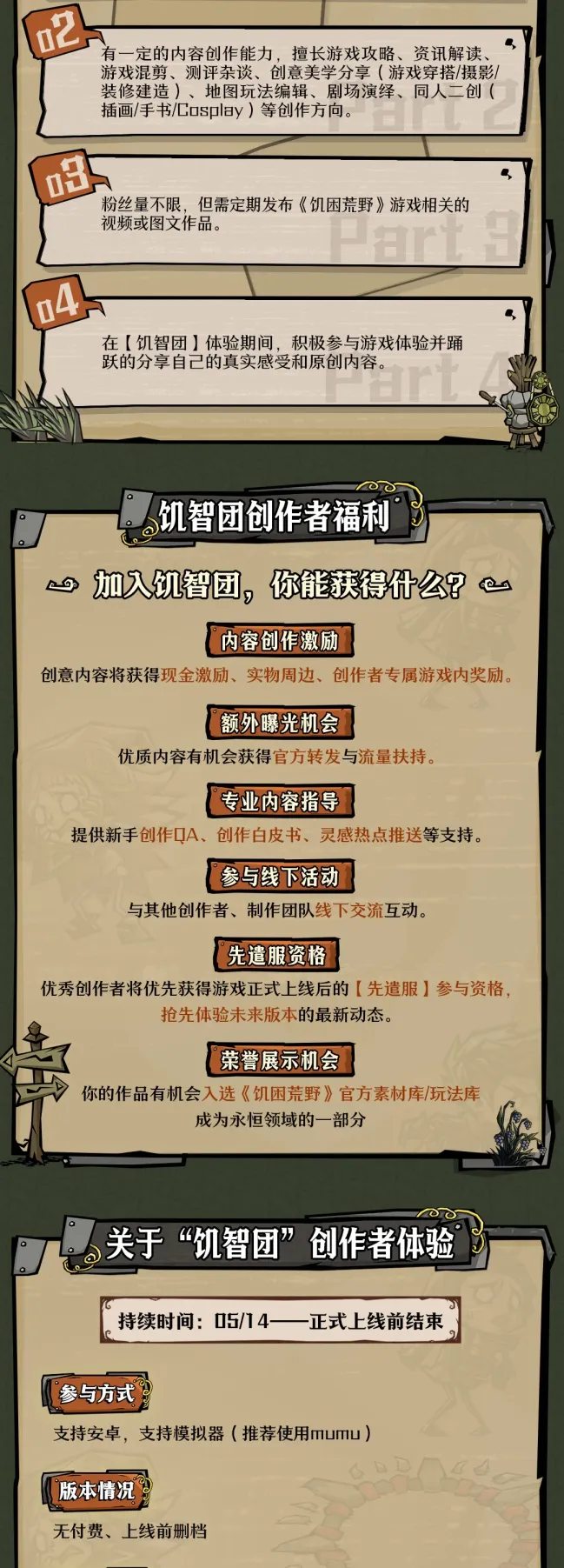 《饥困荒野》“饥智团”创作者招募启动,5月14日开启创作者体验,招募内容创意官、玩法编辑器作者等创作者,加入可获创作激励、曝光机会等福利,可填写问卷报名,助力游戏上线冲刺。