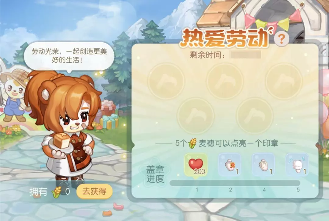 活动介绍:劳动光荣,一起创造更美好的生活!小奥比可通过完成活动任务获取「麦穗」,消耗一定数量「麦穗」点亮印章,累计点亮印章数量即可获得「爱心」、「劳动最光荣」、「擦汗巾」、「满头大汗」等奖励哦!