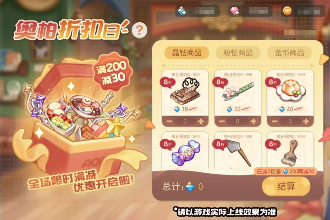 活动介绍:奥柏百货迎来了折扣大酬宾,活动期间,奥柏百货部分道具推出优惠打折活动,前来选购心动的商品吧!