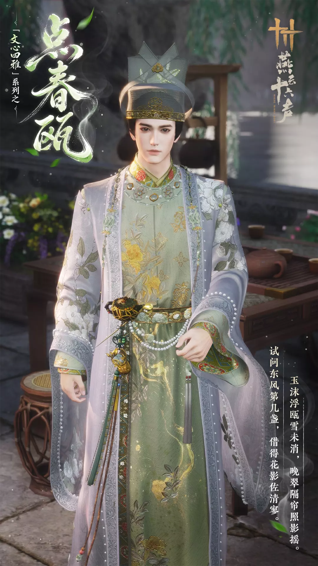 男款则更见宋时衣冠的端整与温雅。头部采用交脚幞头造型,轮廓简净,神气清肃。衣身绣有山茶花纹样,与领口、袖间宋锦花纹彼此呼应,于素雅底色间收出几分内敛华采。整体以月白、淡青为主调,如新茶初成,清润含章,自有疏朗气度。