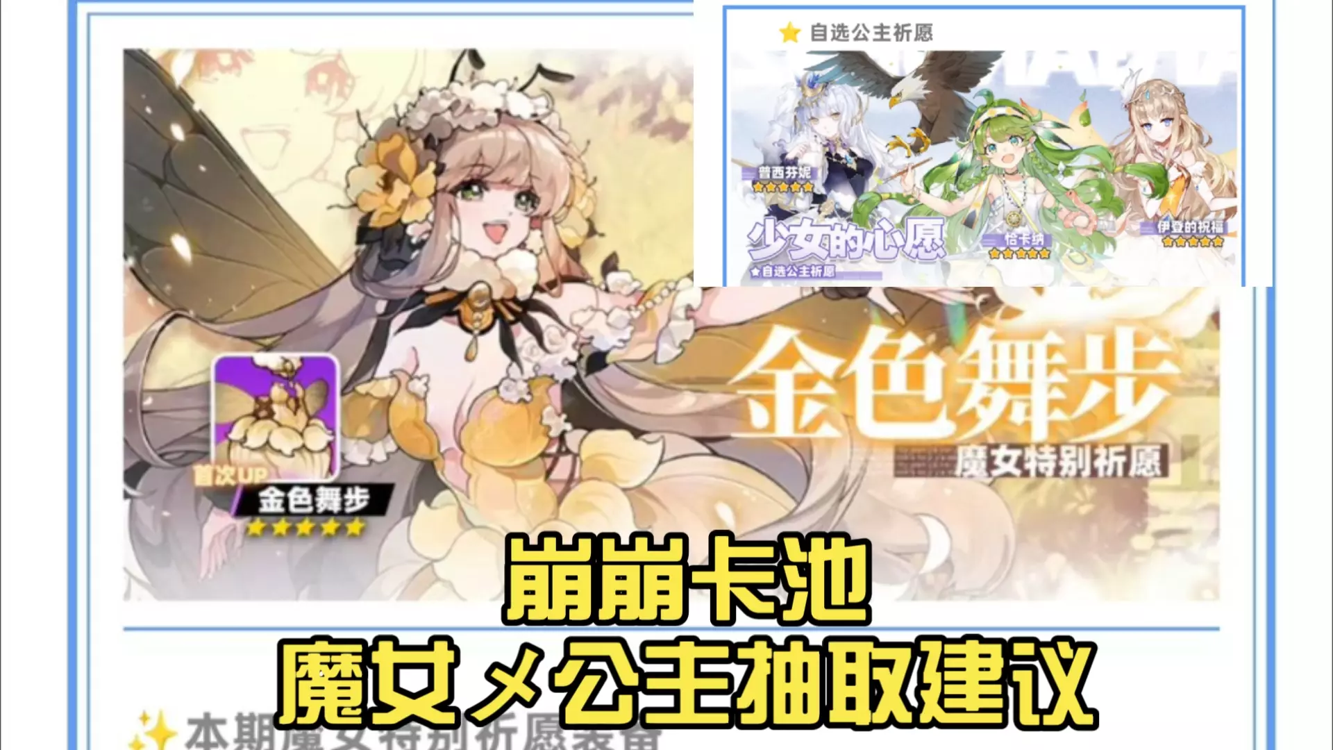 这是《崩坏学园2》的魔女特别祈愿“金色舞步”抽取建议相关内容,活动时间为4月23日0:00-5月1日24:00,金色舞步是适配喷雾类武器的强力服装,能提升移速、全伤害等属性,搭配奥吉莉亚的羽翼等喷雾类装备可发挥更强效果。