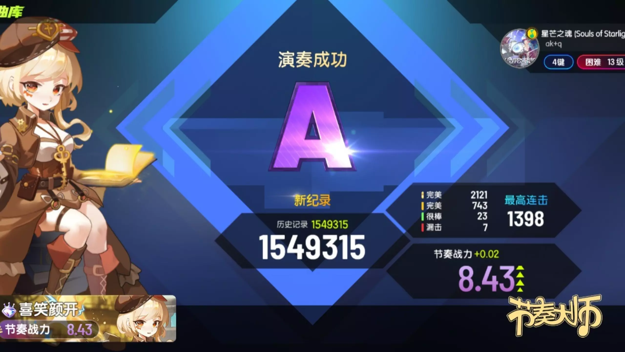 这是一则《节奏大师》的游戏内容,展示了玩家挑战《星芒之魂》4键困难难度的过程,最终达成满分,全程操作精准,多次打出完美判定,展现了高超的游戏技巧。