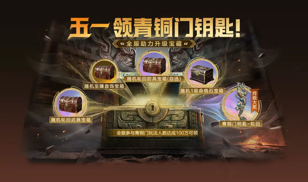 4月27日-5月10日,达成全服参与古墓迷途-青铜门玩法人数成就,自动升级活动宝藏,最多可得随机轮回武器宝箱、随机轮回防具宝箱(自选)、青铜门轮回钥匙等奖励(5月1日起登录即可领取)。