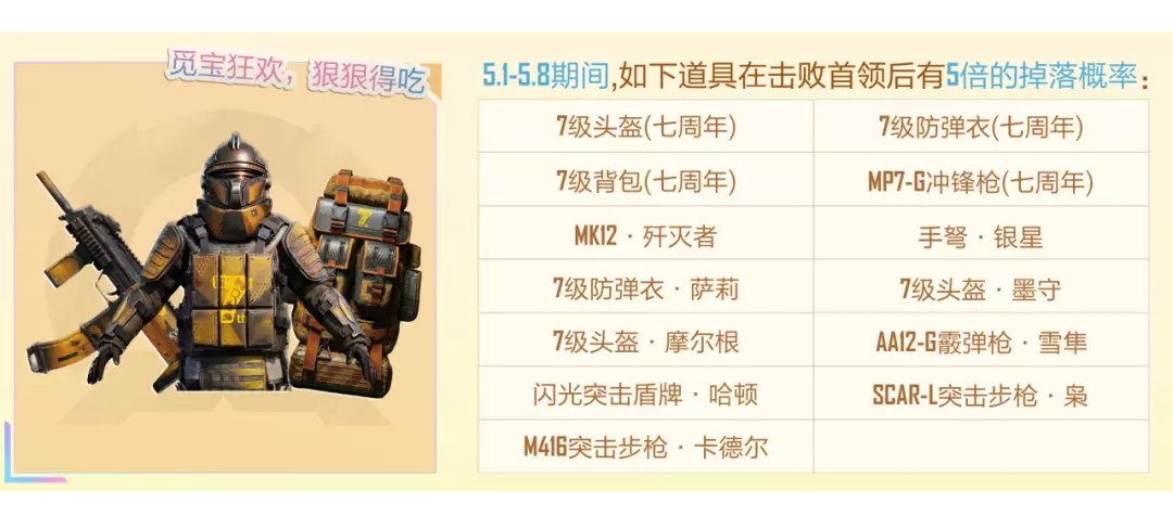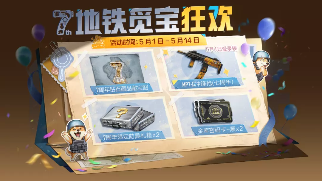 5月1日登录即可领取7周年限定地铁武器装备,5月1日-5月8日期间击败首领更有5倍概率掉落装备(不含传世武装),参与地铁活动还可获得藏宝图-怒兆火山、7周年限定防具礼箱等奖励!