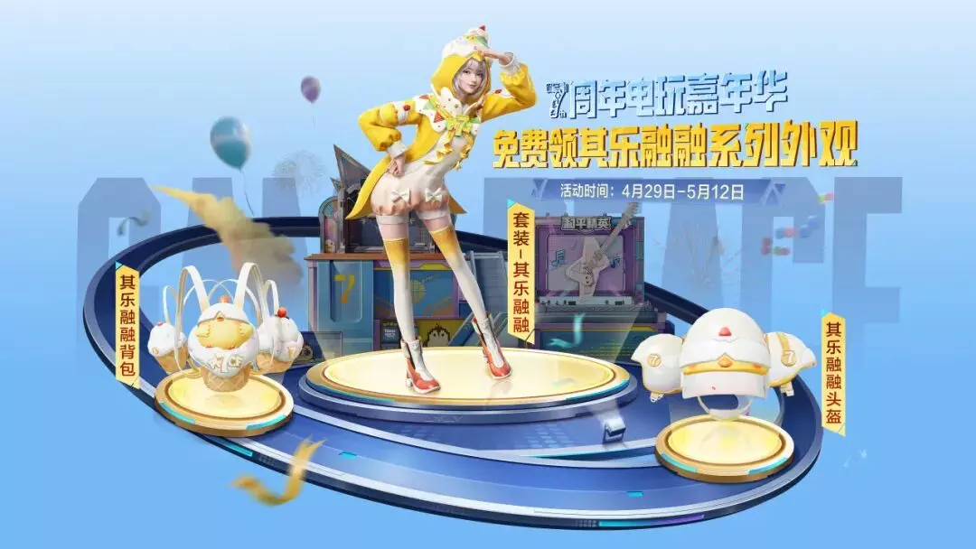 4月29日-5月12日,参与活动获得电玩币,游玩电玩嘉年华游戏项目获得7周年奖券,用于兑换套装-其乐融融、其乐融融背包、其乐融融头盔、变卖物-7周年蛋糕雕像等好礼!