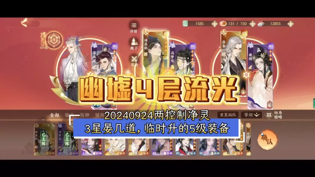 这是《忘川风华录》的关卡攻略,展示了用超标晏几道搭配杨玉环、大乔等名士,利用灵佑、器助等增益效果,三回合速通第五层流光的战斗过程,战斗中打出高额伤害快速推进关卡。