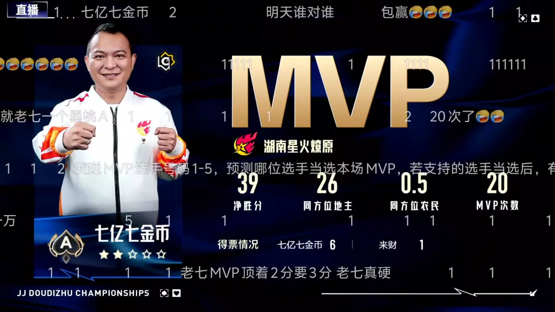 这是一场JJ斗地主冠军杯赛事,湖南星火燎原战队以4:2战胜四川剑开天门战队,选手七亿七拿下MVP,湖南星火燎原成功晋级八强E组,图中呈现了赛事中的精彩对局画面。