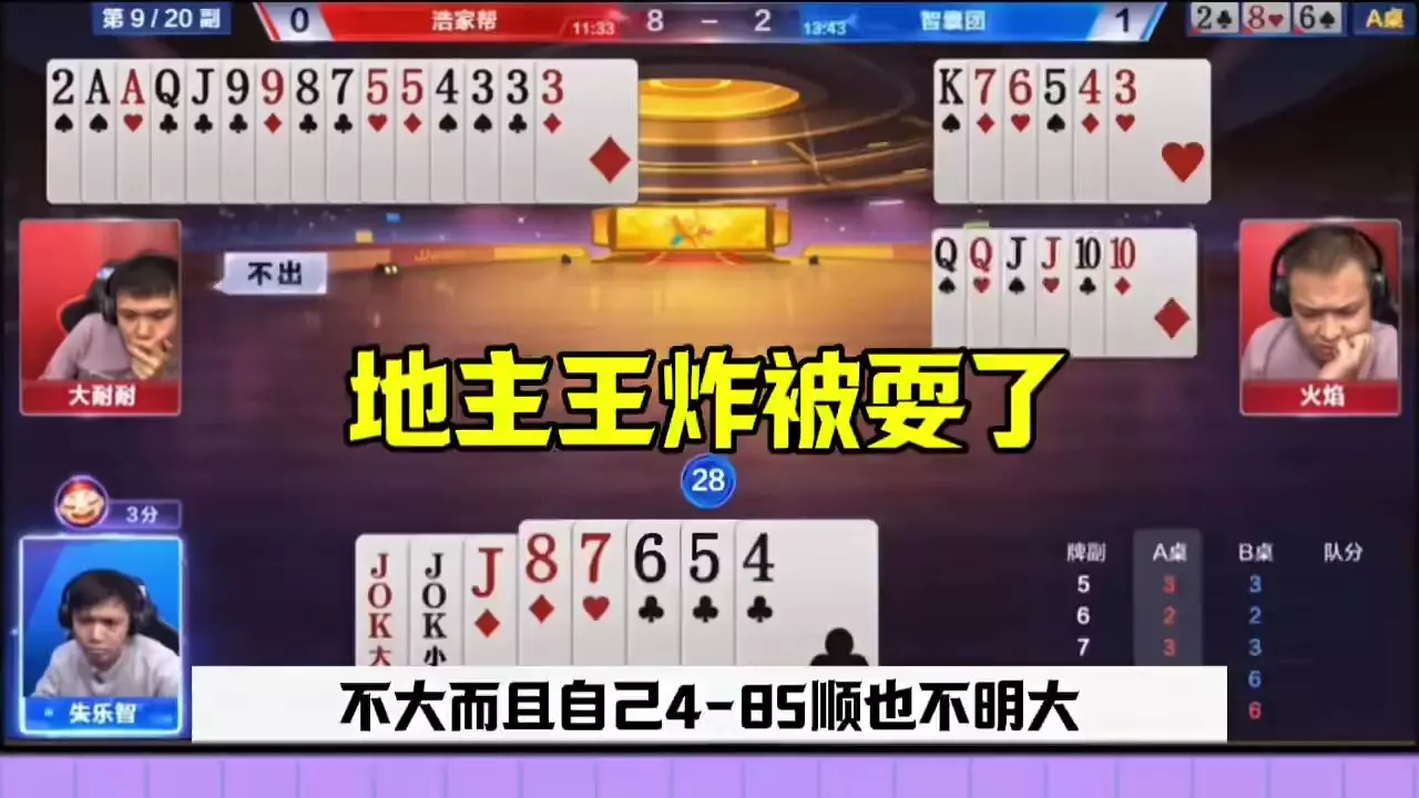 这是一场斗地主冠军杯赛事对局,山西浪人秦与天津狼图腾对战,玩家小石头和无弦琴音打出神配合,成功打崩对手的王炸,展现了精彩的斗地主配合打法。