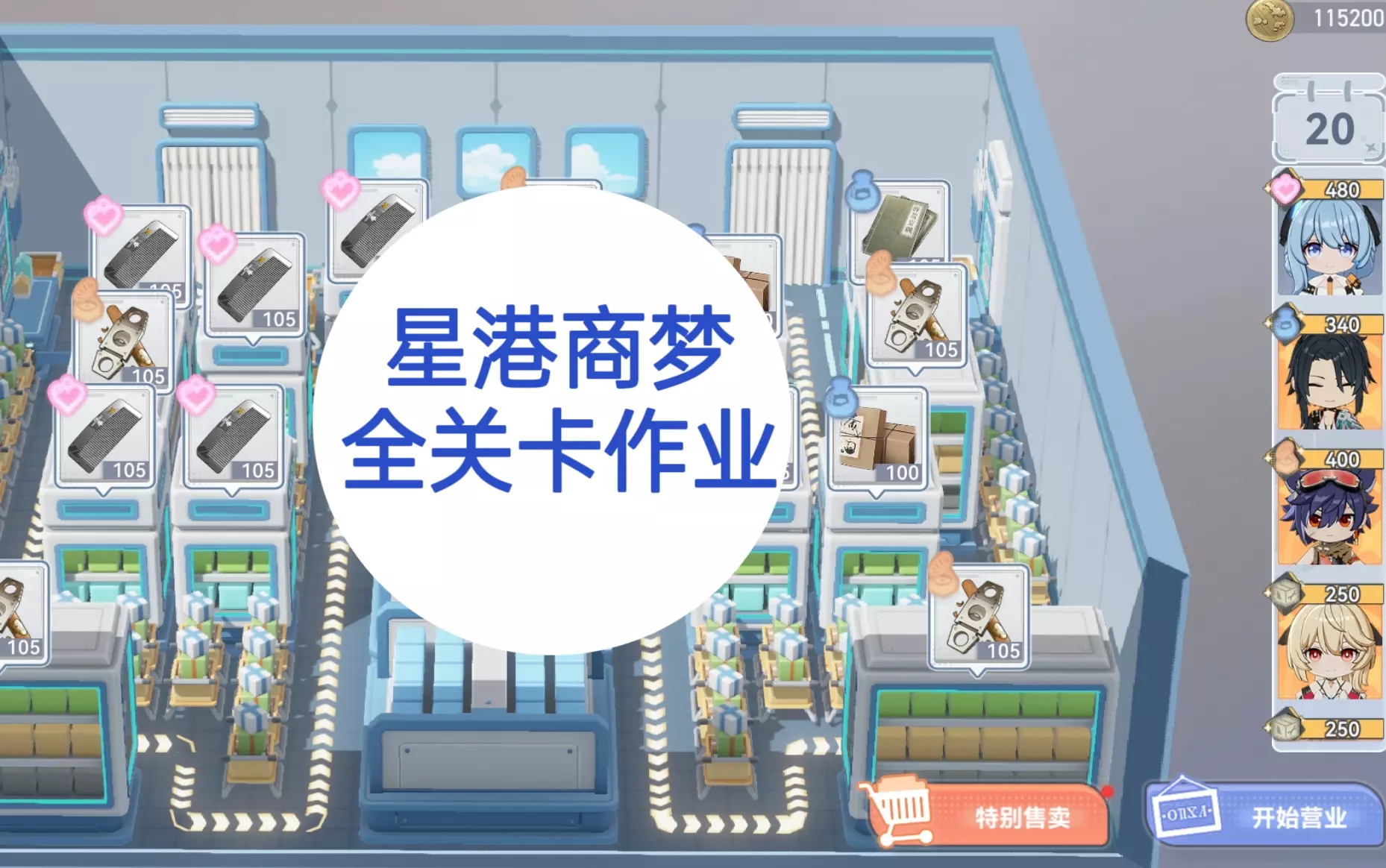 主线前面稍微麻烦点。后面摆好阵型挂机就好。打特别售卖之前记得把柜子都升满。视频里的配置是省钱打法,想省事可以全都用全向柜子。