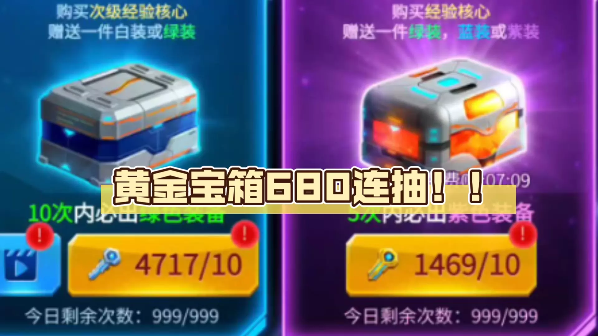这是《雷霆战机》的抽卡内容,展示了寻宝界面的S装备宝箱、装备宝箱、高级装备宝箱三种抽卡宝箱,使用金钥匙开启高级装备宝箱,多次抽取后获得经验核心,界面显示了各宝箱的抽取规则、消耗及剩余次数。