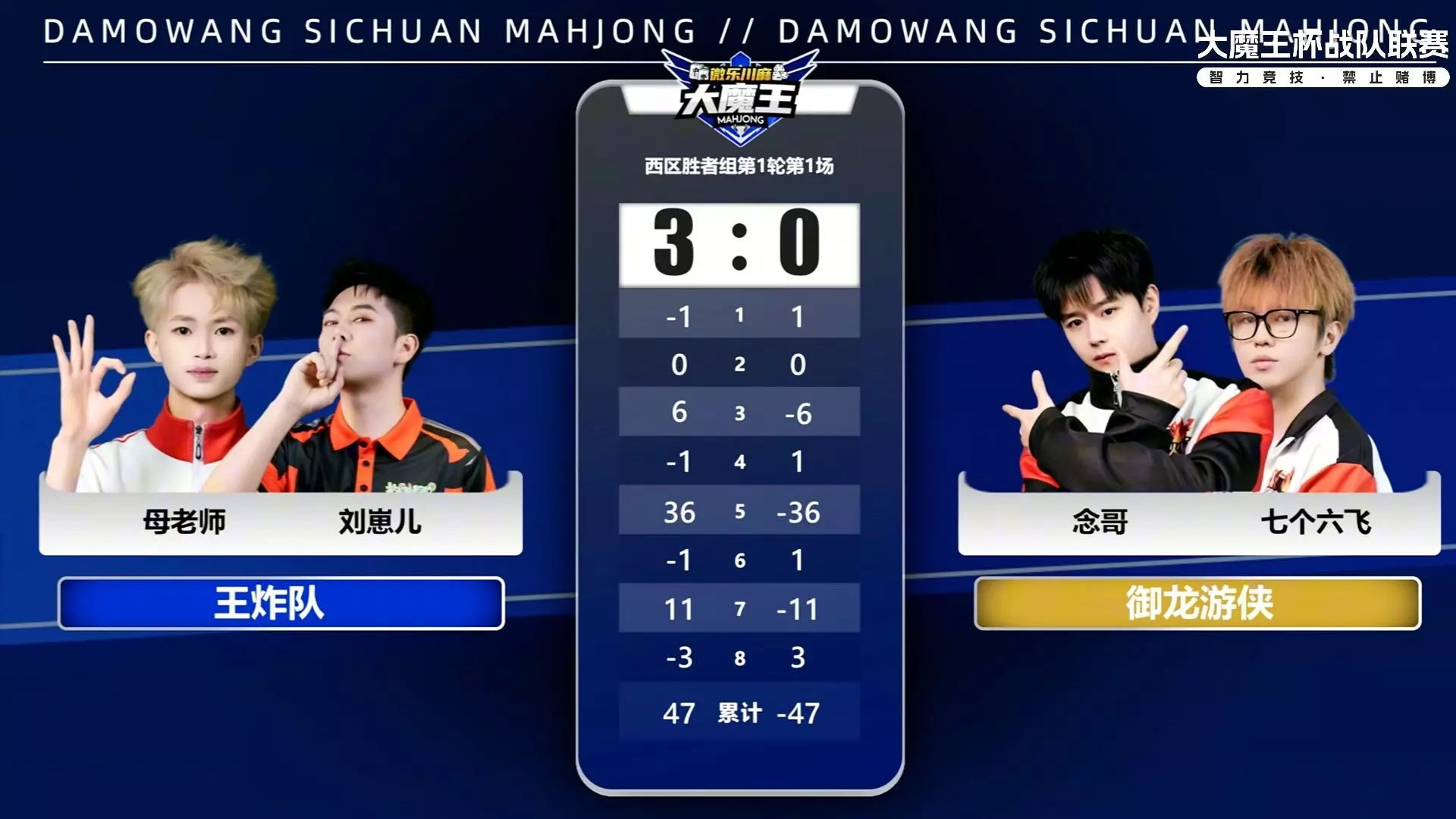这是大魔王杯S8战队联赛西区胜者组第1轮第1场的川麻赛事,御龙游侠队(火同-念哥)对阵王炸队(刘崽儿-母老师),博主下班看赛事时,御龙游侠队分数不佳,调侃队员没把分带回来。