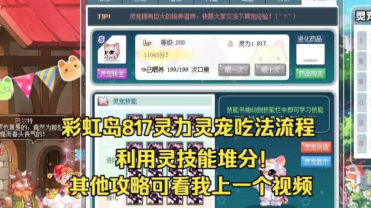 这是彩虹岛新版灵力灵宠相关内容,介绍了817淘淘乐的灵宠养成,包含不同转生分数对应的灵宠养成方案,如灵力值、口粮消耗、技能学习等,还展示了灵宠道具、技能界面及兑换等玩法。