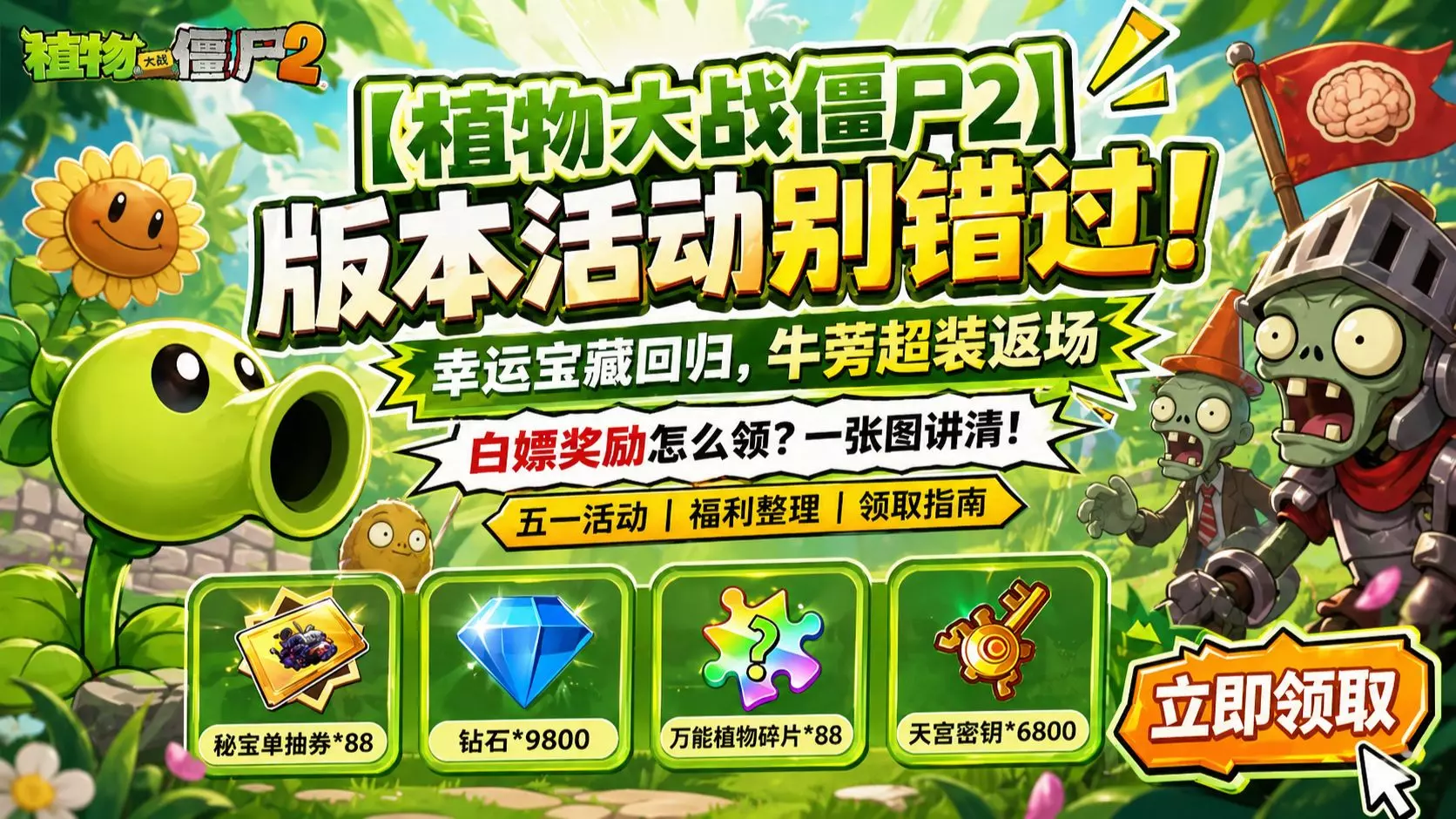 植物大战僵尸2五一版本上线,该版本氪金活动数量反常偏少,还附赠9800钻石与88张秘宝券,同时推出联动活动、多种玩法以及植物装扮,玩家可兑换礼包码领取奖励,奖励丰厚值得关注。