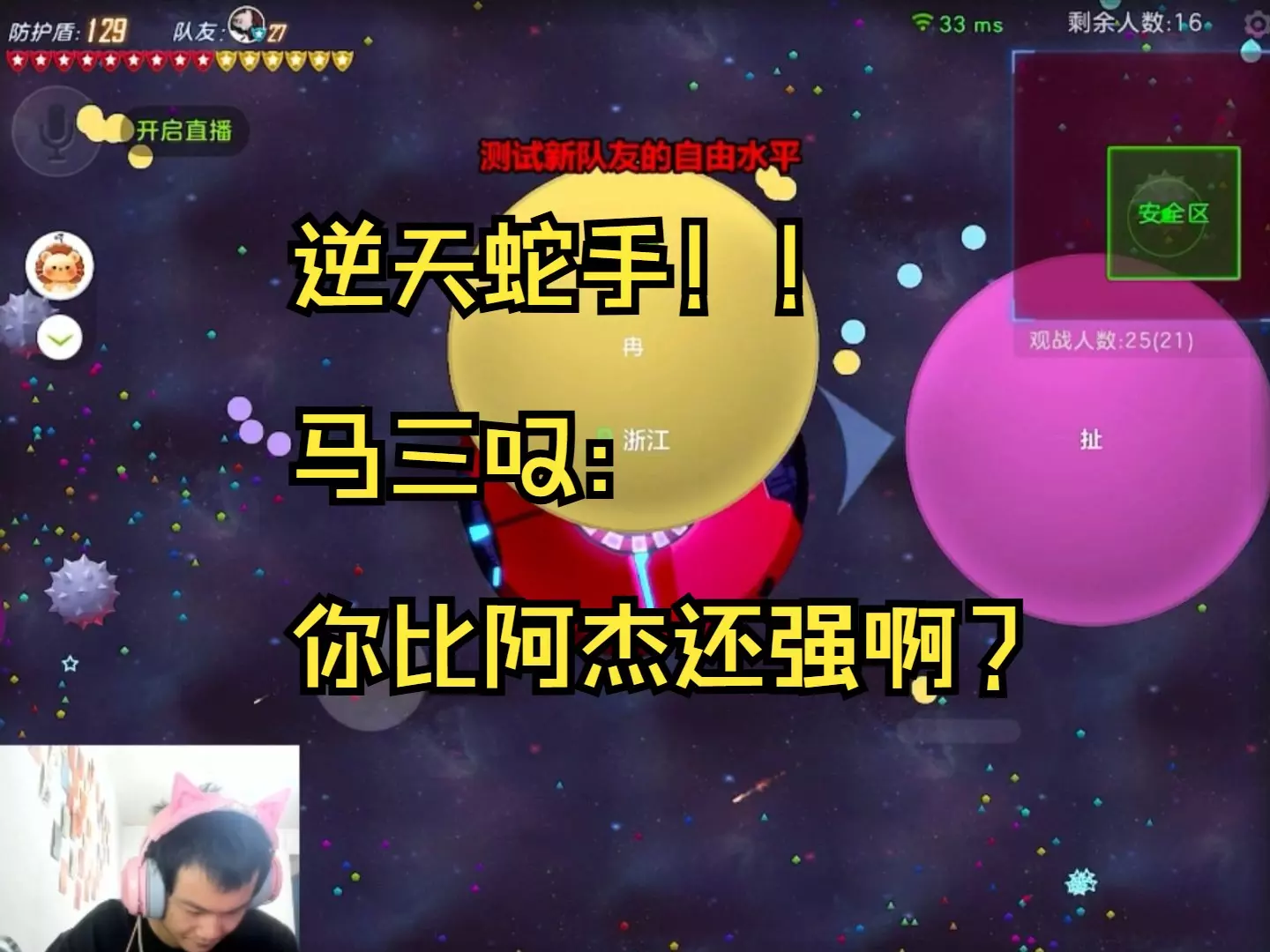这是《球球大作战》的游戏对战画面,展示了玩家在安全区机制、危险区域扩散的对局环境下的操作,玩家对其中的特殊打法发出疑问,画面还呈现了分裂球体等游戏操作与对战场景。