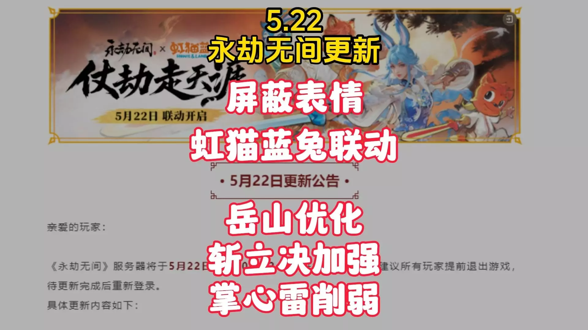 屏蔽表情、虹猫蓝兔联动、局内游戏玩法改变、岳山优化、斩立决加强、掌心雷削弱