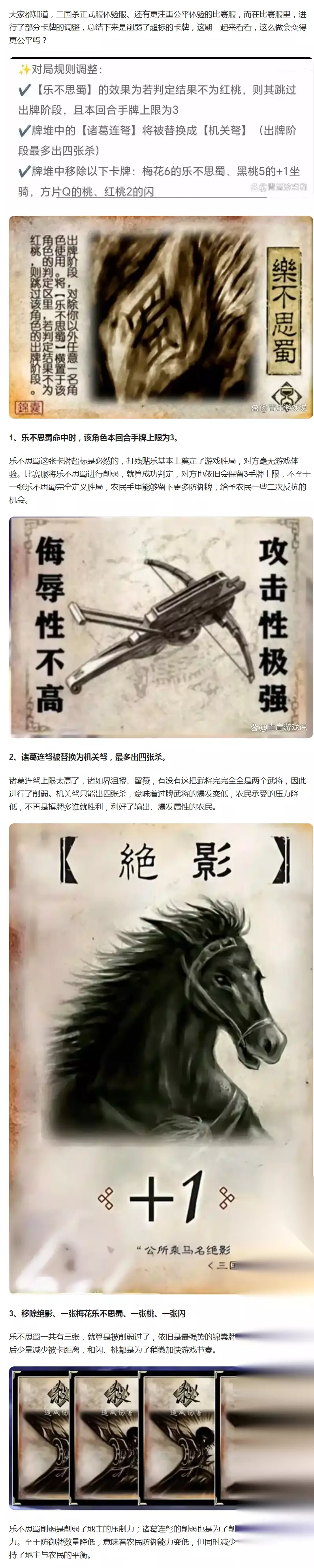 三国杀比赛服对超标的卡牌进行了调整,【乐不思蜀】判定非红桃跳过出牌阶段且本回合手牌上限为3,【诸葛连弩】被替换为最多出四张杀的【机关弩】,还移除了部分卡牌,以此平衡对局,增强游戏公平性。