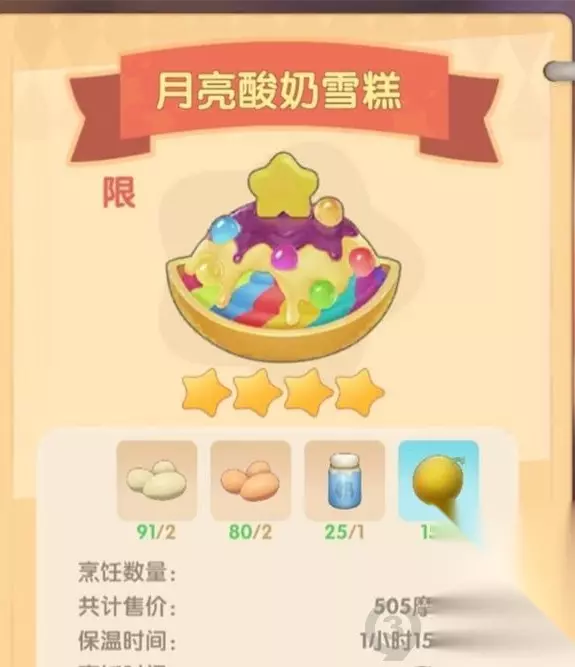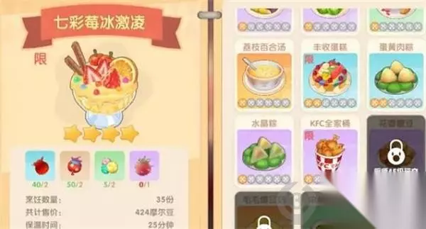 七彩莓冰激凌(2石榴+2奇异果+2棉花糖+1火龙果)、月亮酸奶雪糕(1哈密瓜+1牛奶+2鸡蛋+2鸭蛋):