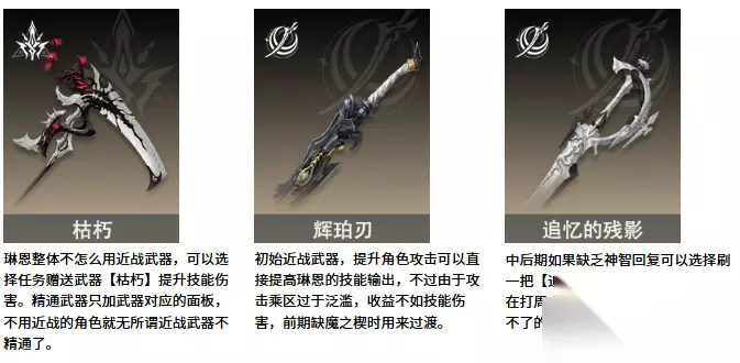 二重螺旋琳恩武器选哪个好 一、近战武器推荐 1、枯朽:提升技能伤害。 2、辉珀刃:初始近战武器,提升角色攻击可以直接提高琳恩的技能输出。 3、追忆的残影:中后期如果缺乏神智回复可以选择刷一把【追忆的残影】,增加续航。