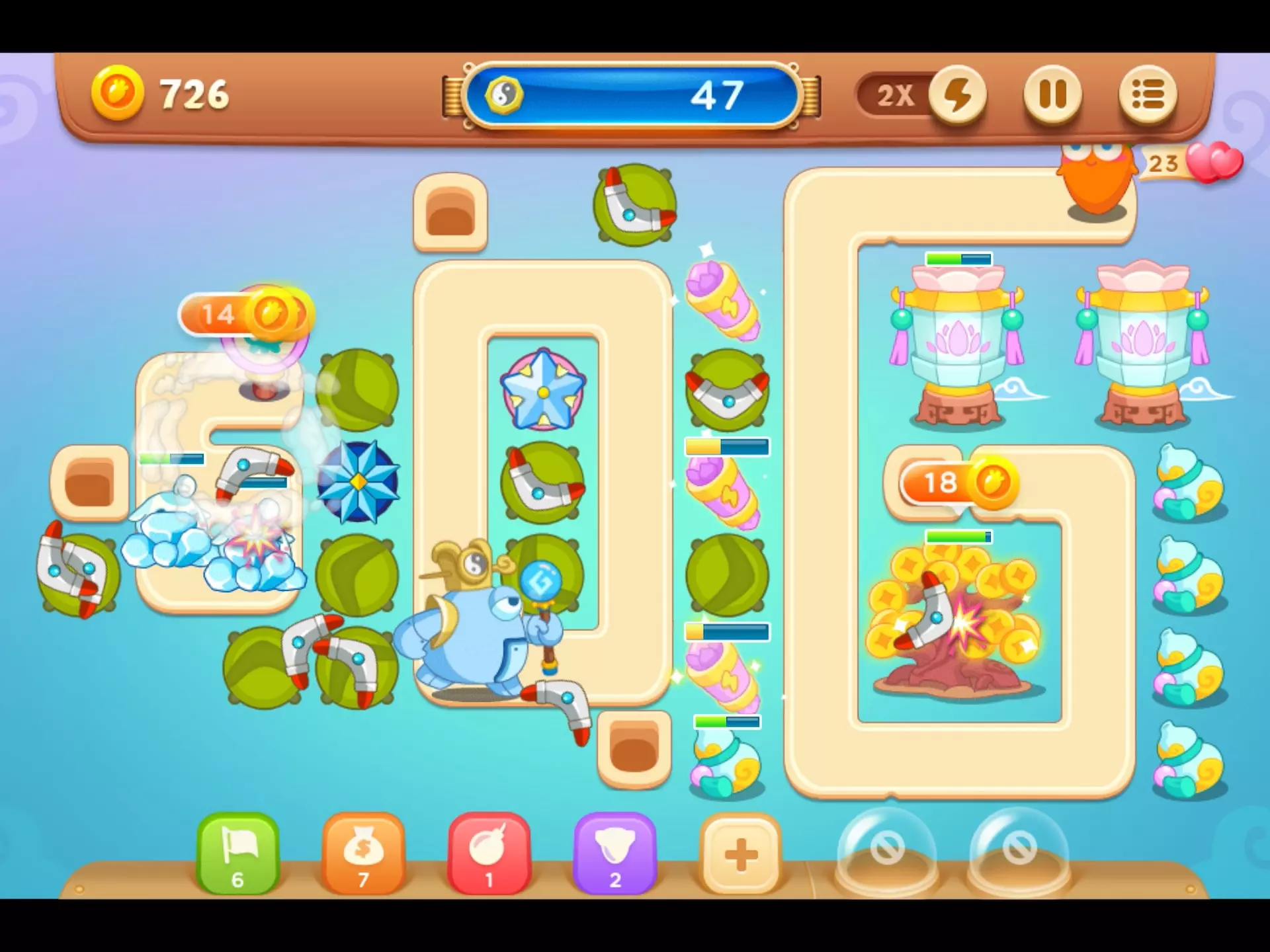第一个地图是工厂篇,首先它们是随机关卡我们要利用好这一点,在每次进入地图之后炮台都是会刷新的,如果认为碰不到好打的地图和攻击力高的炮台可以选择返回再重新进入,反复如此一直刷新出自己想要的炮台来通关,但是这样还是会减少我们的体力的。第二个地图是集市篇,在经过第一个地图的积累之后我们可以将萝卜的等级提升一下,可以将雪球安装在移动空地上,这样可以在减速吃货们的同时还能减少开销,非常实用。第三个码头篇,这次我们就来到了水上作战,这一关卡我们就解锁了船锚炮台,它的攻击属性是非常不错的,可以多安装一些。第四关是公园篇,这一关卡难度会提升,吃货们的血量也会变得很厚,这一关我们可以解锁新的炮台正负电极,在它们链接在同一条X或者Y轴上可以清除同一条直线上的小障碍,但是大障碍还是不能造成伤害的,如果是斜着链接就不会对障碍物造成伤害。到了第五张地图难度开始剧增,很多玩家都会开始栽在这上面,玩家们一定要将萝卜的等级提升上来,如果遇到完全玩不了的关卡可以选择使用左下角的道具,配合着萝卜的技能一起使用。再偷偷告诉大家一招,如果遇到实在没办法的关卡可以选择暂停,返回桌面之后清除掉游戏的后台,这样就不会消耗我们的体力了。