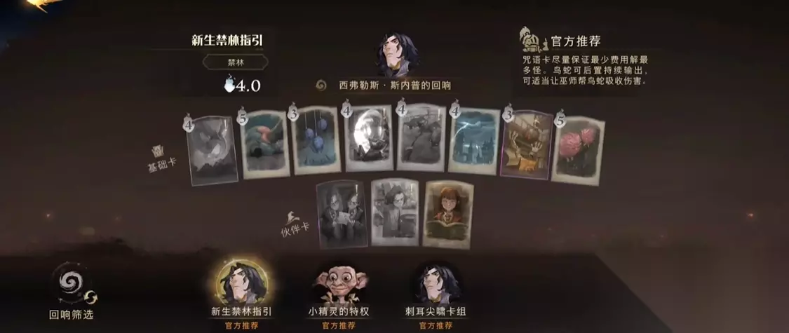 对于禁林等PVE玩法,推荐携带嗅嗅、万弹齐发、云雾缥缈、速速禁锢等兼顾生存与清场能力的卡牌。若挑战高难度副本如驺吾来袭,需针对性调整配置,例如钻心剜骨作为主力输出,随从显形和门钥匙躲避BOSS技能,闪回咒复制关键咒语。邓布利多伙伴卡可帮助队友复制技能,赫敏伙伴卡则能强化核心输出循环。伙伴卡推荐凯文、洛蒂等提供增益或续航的选项。