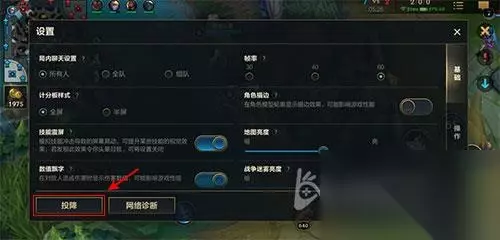 此时在这个设置栏里面,可以看到在左下角,有个投降按钮,然后点击一下。