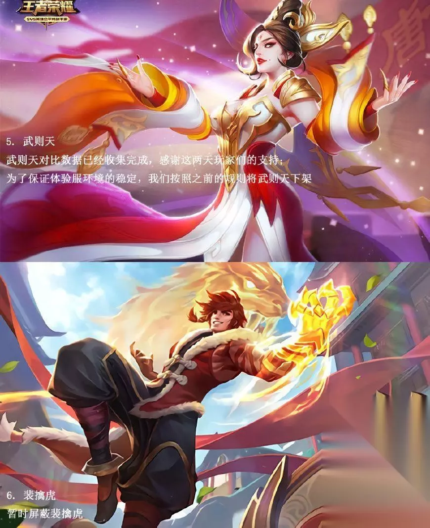 武则天和裴擒虎两位英雄暂时屏蔽。 同时,体验服还修复大乔1技能加速效果描述错误的问题。 【小编推荐】专区入口 || 视频站入口 || 体验服申请入口 || 全民竞猜赢好礼 【新英雄爆料】| 司马懿 || 瑶 || 孙策 || 新英雄:囚徒/书圣/瞬 | 【新皮肤爆料】| 李白团战皮肤:敏锐之力new || 诸葛亮团战皮肤:掌控 || 典韦穷奇皮肤 Hot!! | 王者荣耀最新攻略 赛季段位继承表 每日一题 边境突围玩法攻略 体验服爆料