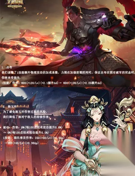 吕布被吐槽战神不再不是一次两次了,天美这次应召唤师们的要求调整了他的AD额外成长系数,不知道那个战神吕布能不能回来。 为了避免新英雄初上线就太强势这个问题,天美最近喜欢上了新英雄上线前削一波的节奏。不过杨玉环本身定位就是辅助,被动和一技能伤害削了也不太影响她辅助的能力。