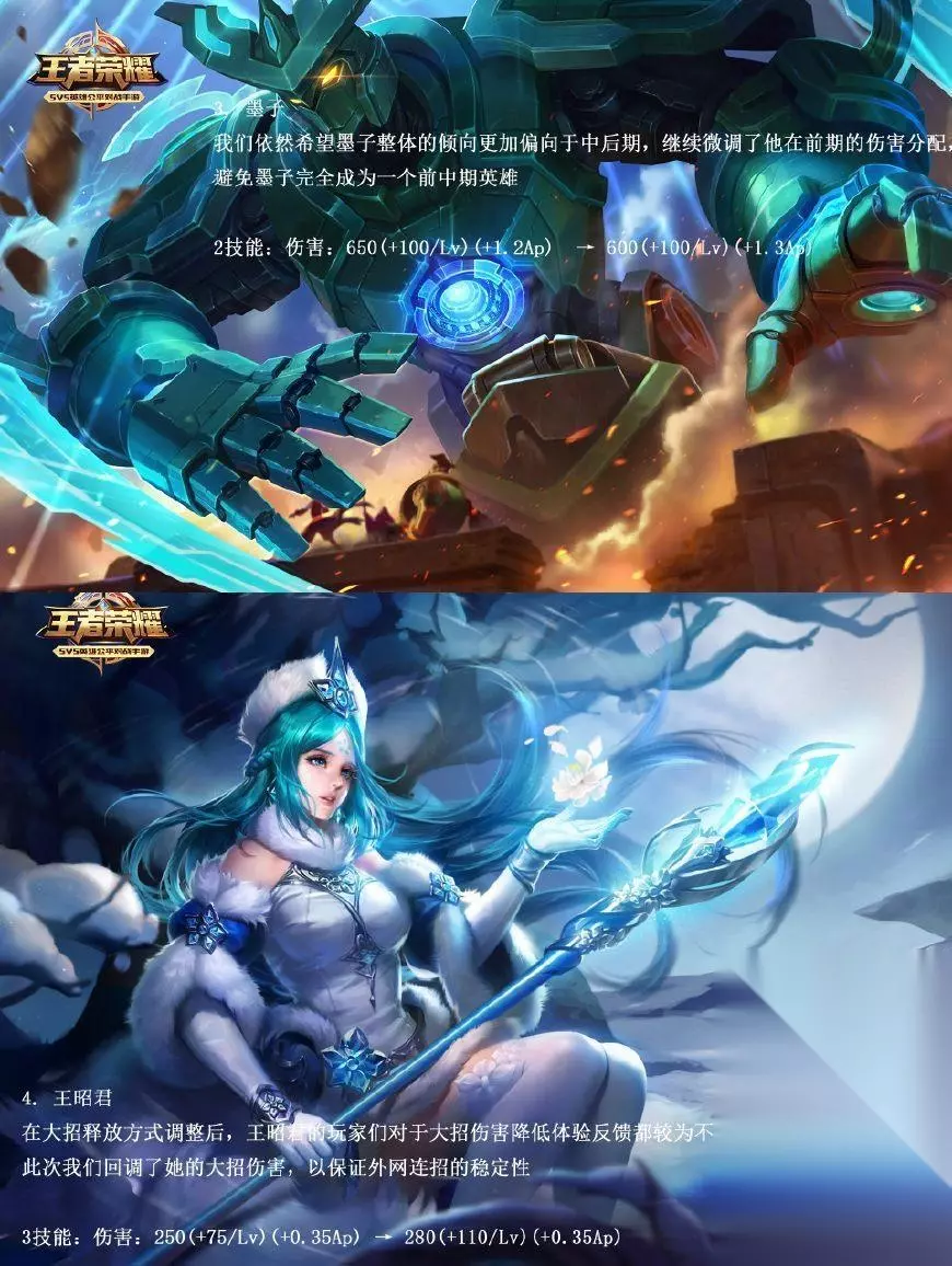 墨子本身就是个后期一炮的英雄,这次天美下调了墨子的伤害,上调了他的AP成长系数,小伙伴们喜欢的墨一炮是真的回来了。 而前段时间更改了三技能的王昭君也因为召唤师们的强烈抗议更改了回来,顺带还上调了她的法伤和等级法术加成,喵酱的凤凰于飞可算能穿出来了。