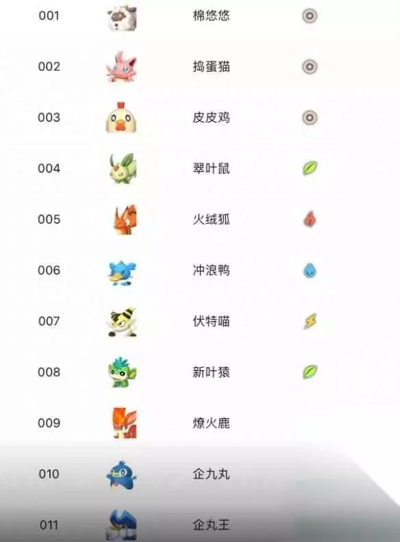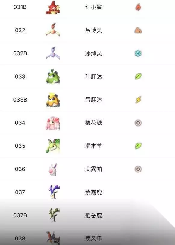 31B、红小鲨 32、吊博灵 32B、冰缚灵 33、叶胖达 33B、雷胖达 34、棉花糖 35、灌木羊 36、美露帕 37、紫霞鹿 37B、衹岳鹿 38、疾风隼
