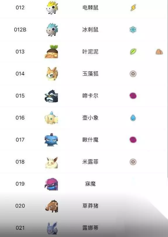 12、电棘鼠 12B、冰刺鼠 13、叶泥泥 14、玉藻狐 15、啼卡尔 16、壶小象 17、瞅什魔 18、米露菲 19、寐魔 20、草莽猪 21、露娜蒂