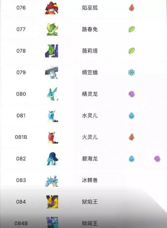 76、焰巫狐 77、路春免 78、薇莉塔 79、绸笠蛾 80、精灵龙 81、水灵儿 81B、火灵儿 82、碧海龙 83、冰棘兽 84、狱焰王 84B、狱阎王