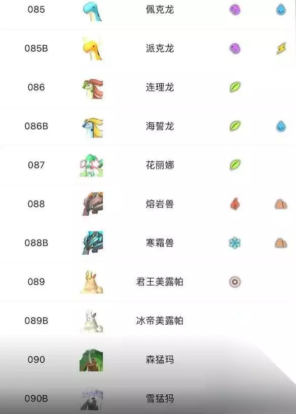 85、佩克龙 85B、派克龙 86、连理龙 86B、海誓龙 87、花丽娜 88、熔岩兽 88B、寒霜兽 89、君王美露帕 89B、冰帝美露帕 90、森猛玛 90B、雪猛犸