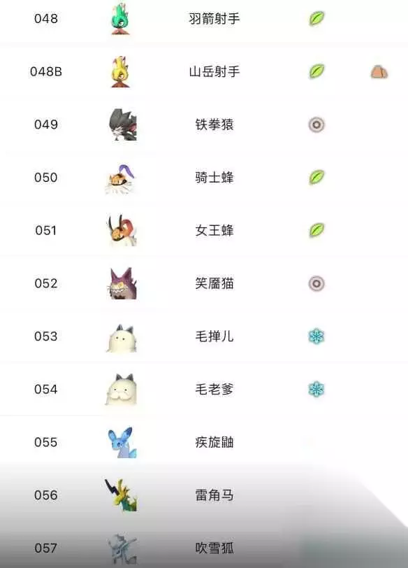 48、羽箭射手 48B、山岳射手 49、铁拳猿 50、骑士蜂 51、女王蜂 52、笑靥猫 53、毛掸儿 54、毛老爹 55、疾旋鼬 56、雷角马 57、吹雪狐