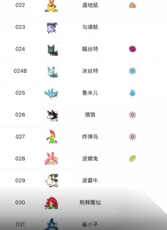 22、遁地鼠 23、勾魂鱿 24、瞄丝特 24B、冰丝特 25、鲁米儿 26、猎狼 27、炸弹鸟 28、波娜兔 29、波霸牛 30、荆棘魔仙 31、鲨小子