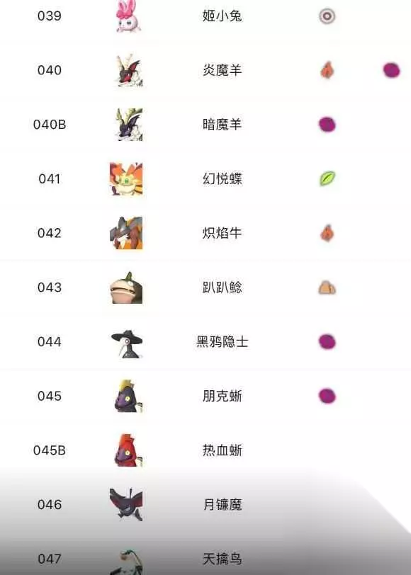 39、姬小兔 40、炎魔羊 40B、暗魔羊 41、幻悦蝶 42、炽焰牛 43、趴趴鲶 44、黑鸦隐士 45、朋克蜥 45B、热血蜥 46、月镰魔 47、天擒鸟