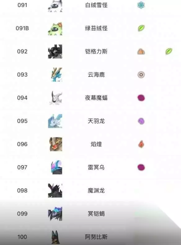 91、白绒雪怪 91B、绿苔绒怪 92、铠格力斯 93、云海鹿 94、夜幕魔蝠 95、天羽龙 96、焰煌 97、雷冥乌 98、魔渊龙 99、冥铠蝎 100、阿努比斯