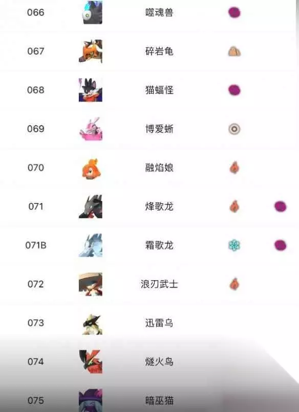66、噬魂兽 67、碎岩龟 68、猫蝠怪 69、博爱蜥 70、融焰娘 71、烽歌龙 71B、霜歌龙 72、浪刃武士 73、迅雷乌 74、燧火鸟 75、暗巫猫
