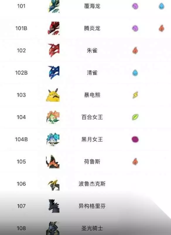 101、覆海龙 101B、腾炎龙 102、朱雀 102B、清雀 103、暴电熊 104、百合女王 104B、黑月女王 105、荷鲁斯 106、波鲁杰克斯 107、异构格里芬 108、圣光骑士