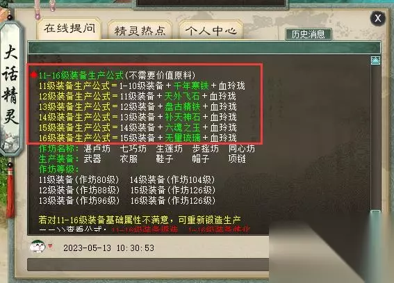 11-16级装备生产公式(不需要价值原料): 11级装备生产公式=1-10级装备 千年寒铁 血玲珑 12级装备生产公式=11级装备 天外飞石 血玲珑 13级装备生产公式=12级装备 盘古精铁 血玲珑 14级装备生产公式=13级装备 补天神石 血玲珑 15级装备生产公式=14级装备 六魂之玉 血玲珑 16级装备生产公式=15级装备 无量琉璃 血玲珑